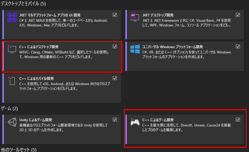 ダウンロードした実行ファイルを実行すると、Visual Studio Installerが起動するので出てくる説明に従って以下の画面まで進めてください