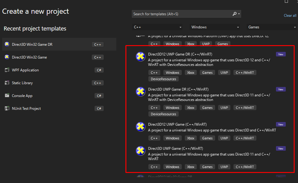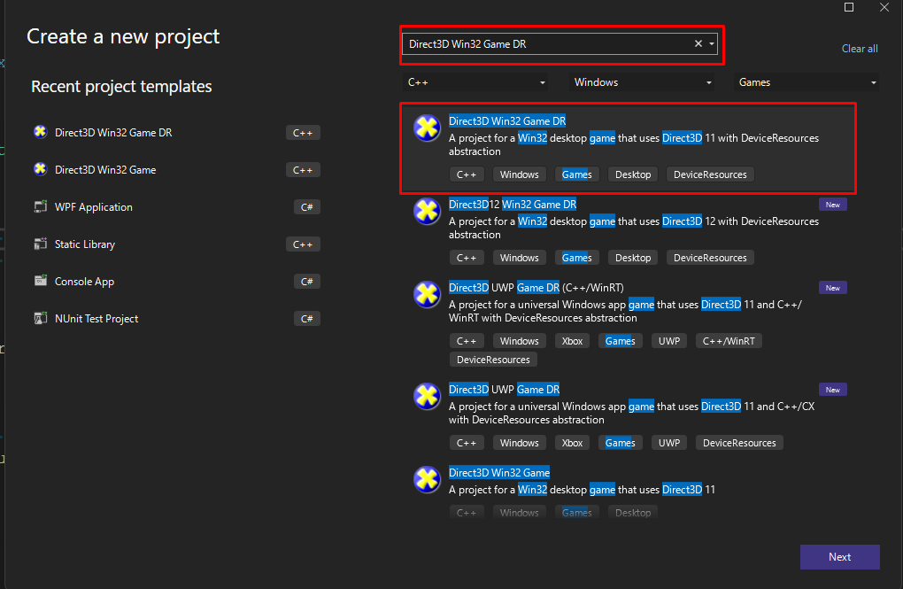 新しいプロジェクトのテンプレート選択画面で、検索欄に「Direct3D Win32 Game DR」と入力してすべてがマッチしたテンプレートを選択してください。