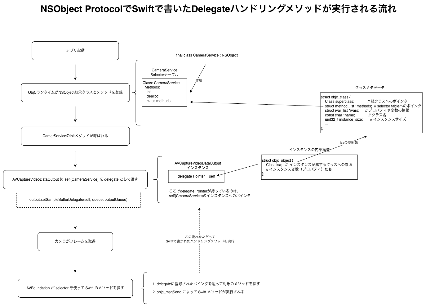 AVFoundationはガッツリObject-Cがバックで動いているので、以下のような流れでNSObjectを継承した効果が発揮されてSwiftで書いたコードがObject-Cランタイムから呼び出さ